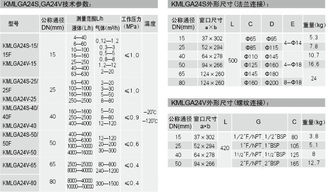 KMLGA玻璃轉子流量計與KML10S、KML20S、KML30S比較配備了疊層玻璃的保護罩,安全系數更高,不必從管道上拆下整機即可更換椎管與浮子。
