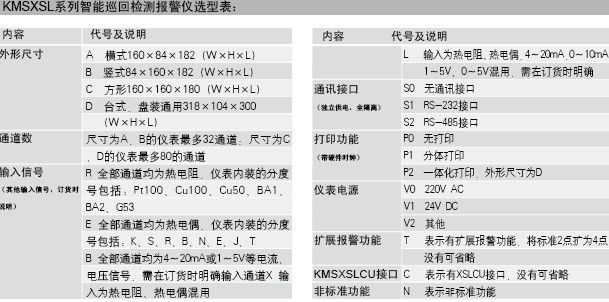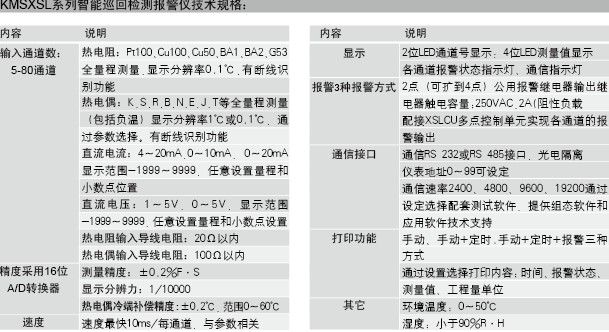 用于多點測量、報警、采集 ①抗干擾設計,抑制現場的繼電器、接觸器等產生的快速脈沖群干擾和其他電磁干擾,抗干擾能力達到III級; ②各輸入通道均帶浪涌,過壓保護; ③KMSXSL系列為全功能標準型,除4點公用報警外,可配合控制單元實現32點報警輸出,可配接大屏顯示器。 KMSXSL系列智能巡回檢測報警儀特點: ●2級參數,第2級組態參數受密碼控制,具備參數復制功能,可快速進行參數設置,大大減少參數設置的工作量; ●獨特實用的報警功能:每通道可設置2個報警值,通過報警方式選擇為上限或下限,能實現上、上上限,上、下限,下、下下限功能獨立的報警靈敏度設置。 ●多點報警可選用KMXSLCU控制單元; ●各通道獨立的報警指示燈,不亮、閃爍、亮3種狀態,不亮表示不報警,閃爍表示進入報警,按消音鍵后轉為亮; ●計算機可通過通信接口一次讀指定的1個或數個通道或全部通道的數據,大大縮短通信時間; ●輸入電路帶保護,提高可靠性和抗干擾能力。 輸入5~80通道,熱電阻、熱電偶、電流、電壓輸入;基本誤差±0.2%F·S,顯示范圍-1999~9999(檢測速度0.1~0.2秒/每通道);各通道獨立設定信號類型、量程、報警值;各通道獨立的調校功能,有效減少傳感器誤差,提高系統的測量、控制精度;可任意關閉不使用的通道,被關閉后的通道不再顯示、報警、打印。