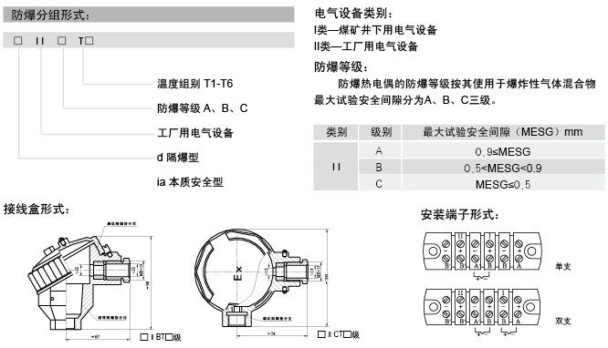 防爆熱電偶是利用間隙隔爆原理,設計具有足夠強度的接線盒等部件,將所有會產生火花、電弧和危險溫度的零部件都密封在接線盒腔內,當腔內發生爆炸時,能通過接合面間隙熄火和冷卻,使爆炸后的火焰和溫度傳不到腔外,從而進行隔爆。