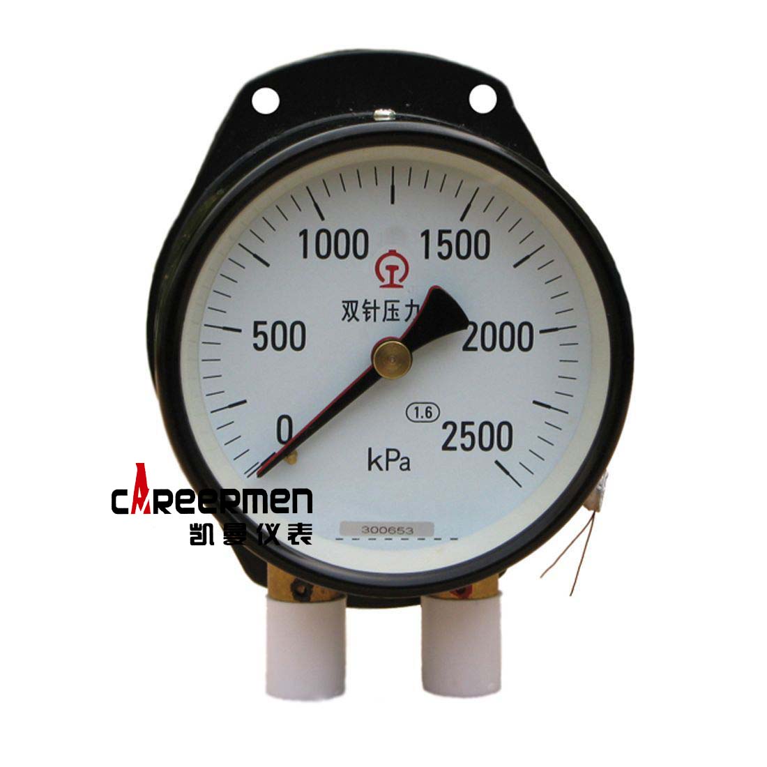 雙針壓力表主要適用于機車車輛上用來測量液壓系統或儲氣、缸內的壓力亦可用于對銅合金及錫鉛合金釬焊料無腐蝕性、非結晶和凝固的各種介質的壓力測量。儀表可同時測量兩個相同或不相同(兩者之差一般應不在于標度范圍上限值的1/3)的壓力。