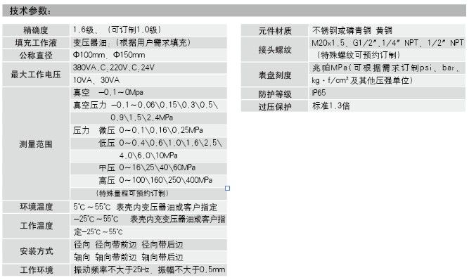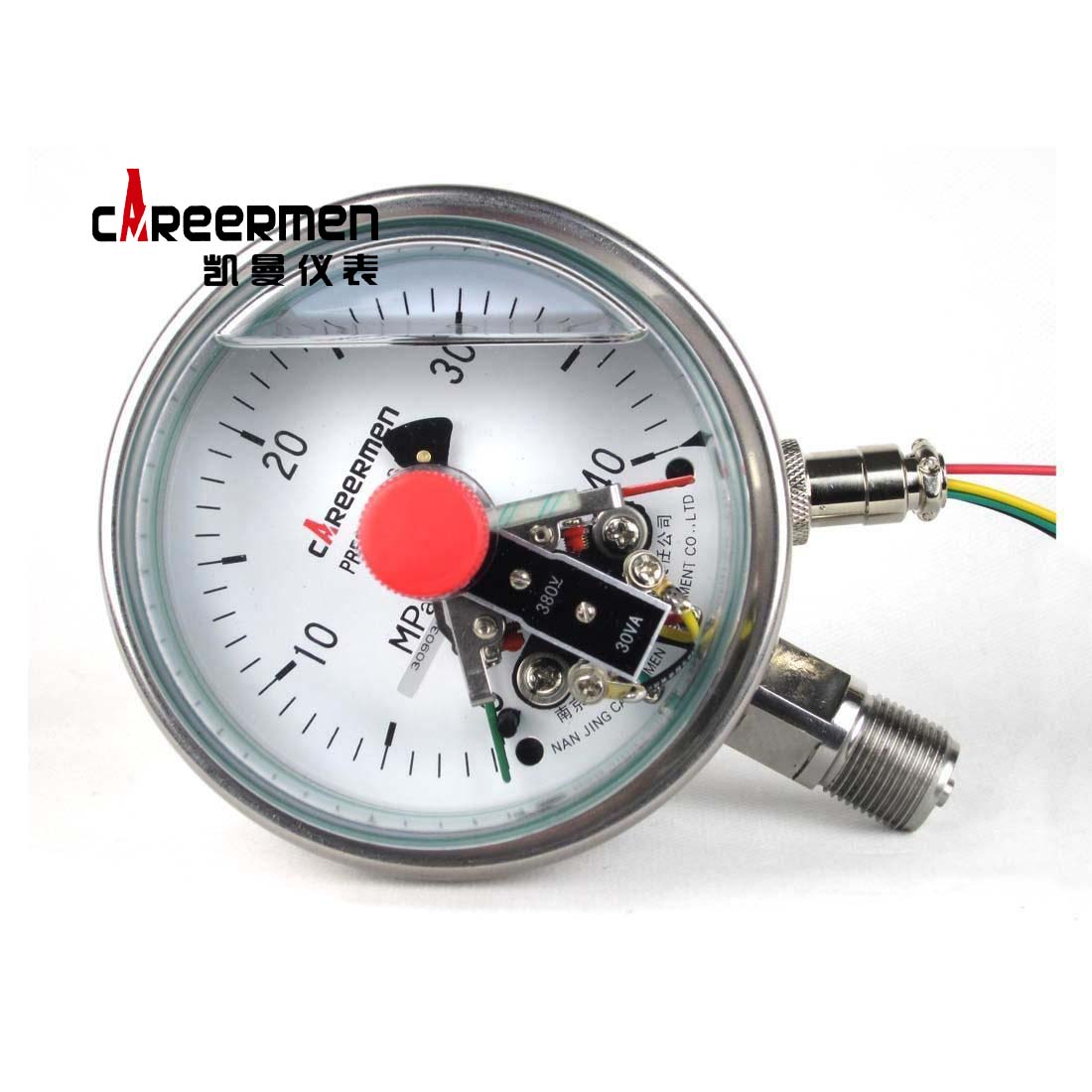 耐震電接點壓力表概述: 耐震電接點壓力表具有抗介質脈動和沖擊載荷,耐環境振動等優異特性,適用測量對銅和銅合金無腐蝕性的氣體,液體或蒸汽等壓力。儀表設上、下限二位開關型接點裝置,在壓力達到設定值時發出信號或通斷控制電路,供作業系統自動控制或發訊用。其抗振結構可有效抑制指針的抖動、沖擊,保護接點,使儀表指示清晰,電信號切換可靠,工作穩定。廣泛應用于機械、化工、石油、冶金、電力等工業生產過程。