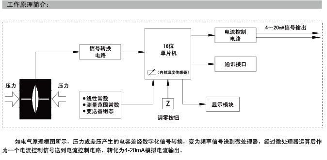 KMSST數(shù)字式電容壓力/差壓變送器的核心部件采用十六位單片機(jī),其強(qiáng)大的功能和高速的運(yùn)算能力保證了變送器的優(yōu)良品質(zhì)。整個(gè)的設(shè)計(jì)框架著眼于可靠性、穩(wěn)定性、高精度和智能化,滿足日益提高的工業(yè)現(xiàn)場(chǎng)應(yīng)用之要求。為此,軟件中應(yīng)用了數(shù)字信號(hào)處理技術(shù),使其具有優(yōu)良的抗干擾能力和零點(diǎn)穩(wěn)定性,且具備零點(diǎn)自動(dòng)穩(wěn)定跟蹤能力(ZSC)和溫度自動(dòng)補(bǔ)償能力(TSC)。強(qiáng)大的界面功能無需手操器保證了良好的交互性。數(shù)字液晶顯示表頭能夠顯示壓力、溫度、電流三種物理量,及0-100%模擬指示,按鍵操作能方便地在無標(biāo)準(zhǔn)壓力源的情況下完成零點(diǎn)遷移、量程設(shè)定、阻尼設(shè)定等基本的參數(shù)設(shè)置,而且可以重新對(duì)變送器進(jìn)行標(biāo)定,極大地方便了現(xiàn)場(chǎng)調(diào)試。S-PORT串行通信口通過專用轉(zhuǎn)接模塊直接與計(jì)算機(jī)通信,上位機(jī)界面可以完成比按鍵操作更多的功能。接專用RS485模塊可以實(shí)現(xiàn)數(shù)字信號(hào)遠(yuǎn)傳,或構(gòu)建RS485工業(yè)局域網(wǎng)。信號(hào)轉(zhuǎn)換、信號(hào)采集與處理及電流輸出控制采用了一體化設(shè)計(jì),使結(jié)構(gòu)更加緊湊可靠。敏感部件與變送器原理相同,具有穩(wěn)定、可靠、抗振的特點(diǎn),并具有良好的互換性。