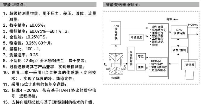 電容式智能型壓力、差壓與絕壓變送器: 1、性能優秀:精度±0.075%~±0.1%; 2、量程比:100:1; 3、測量范圍:60Pa至40MPa; 4、隔離膜片:316L不銹鋼、哈氏合金、蒙乃爾、鉭及重金屬膜片; 5、設計小巧、堅固輕量、易于安裝、2.4kg、166mm。 電容式智能型法蘭液位變送器: 1、液位測量精度達±0.075%~±0.1%; 2、測量范圍:500mmH2O至250000mmH2O; 3、平膜式、插入式及法蘭規格可選; 4、可選灌充液,滿足不同場合測試; 5、接液材質:316L不銹鋼、哈氏合金、蒙乃爾、鉭及重金屬膜片可選。 電容式智能遠傳法蘭壓力、差壓變送器: 1、測量范圍:6KPa至1MPa; 2、一體化波紋座設計,減少溫度影響,提高抗過壓性; 3、多種遠傳法蘭,多種過程連接方式; 4、差壓、壓力、液位測量。