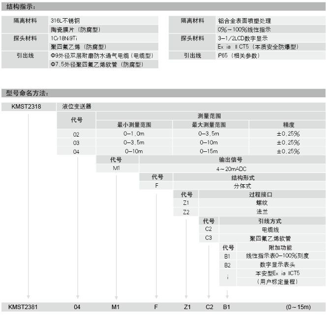 KM-ST2318系列液位變送器選用著名的美國NovaSensor公司高精度、高穩定性擴散硅壓力傳感器組件,通過高可靠性的放大電路及精密溫度補償,將被測液體的液位信號轉換成4~20mADC標準電信號。高質量的傳感器、精湛的對裝技術以及完善的裝配工藝確保了該產品的優異質量和最佳性能。本產品為分體式結構形式,并有電纜型品防腐型兩種介質測量類型。防腐型產品可以抵御多種腐蝕性液體的侵蝕,能夠最大限度的滿足客戶的需要。ST2318系列液位變送器分普通型和本質安全防爆型兩種型式,防爆型能廣泛應用于工業現場中的各種惡劣及危險場所。