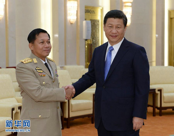 2013年10月16日,國家主席、中央軍委主席習近平在人民大會堂會見緬甸國防軍總司令敏昂萊! ×暯秸..