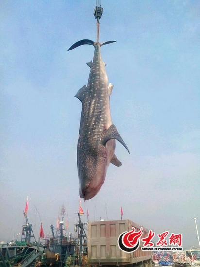 一條2萬多斤重的大鯊魚在日照驚現,被漁民捕撈出售。      ..